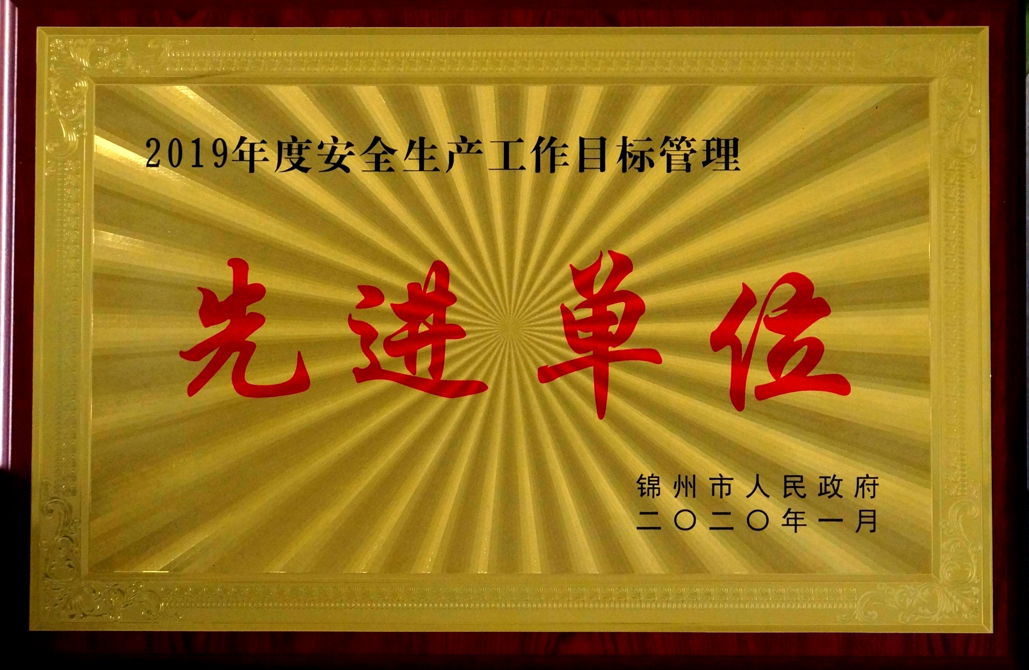 2020年4月,公司被錦州市政府授予“2019年的安全生產(chǎn)工作目標管理先進單位”榮譽稱號。